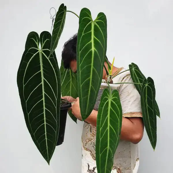 Anthurium warocqueanum, známé také jako „královské anthurium,“ je vyhledáváno pro své dlouhé, tmavozelené listy se stříbrnou žilnatinou, které mohou dorůst až do délky 1 metru, čímž připomínají klenoty pralesů.