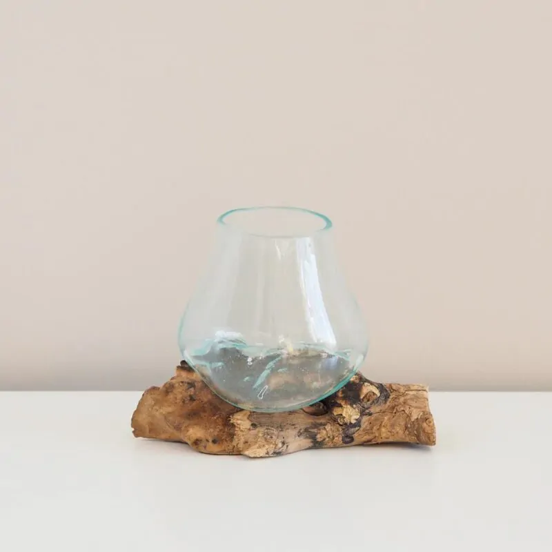 Akvárium na dřevě je výjimečný designový doplněk do domácnosti. Je ručně vyrobeno přímo na exotickém ostrově Bali. Každý kus má jedinečný dřevěný podstavec ze dřeva Gamal. Akvárium je foukané z recyklovaného skla . Ještě za horká se přiloží na dřevo a tak se vytvaruje jeho specifický tvar, který zaručí, že na dřevě drží i bez toho, aniž by muselo být přilepeno.