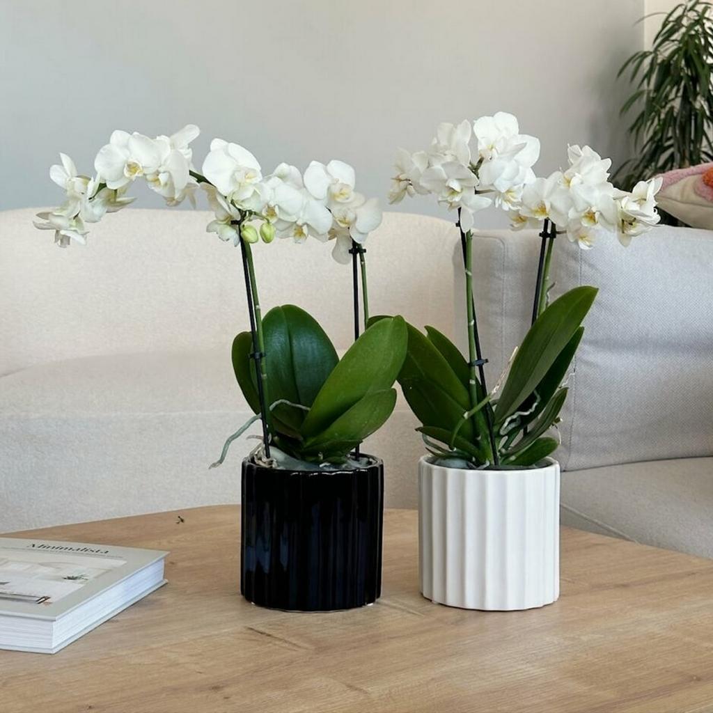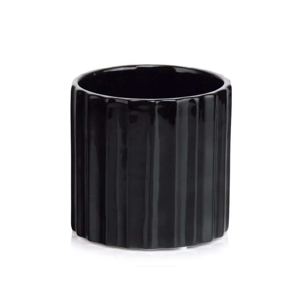 Jednoduchý černý lesklý keramický květináč s jemným geometrickým vzorem. Svým jednoduchým vzhledem se hodí do každého interiéru. Díky neutrálnímu designu v něm skvěle vyniknou všechny zelené i barevné pokojové rostliny.