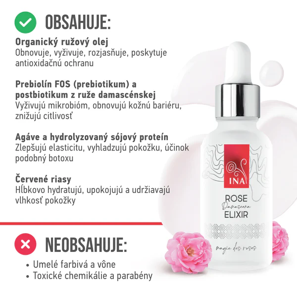 Rose Elixir je intenzivně omlazující sérum na pleť s obsahem organického růžového oleje – „tekutého zlata“ – doplněného o silné rostlinné aktivní látky, které viditelně rozjasňují pleť, redukují jemné vrásky a obnovují její pružnost. Lehká textura na vodní bázi se rychle vstřebává a zanechává pleť hladkou, svěží a zářivou již po první aplikaci.