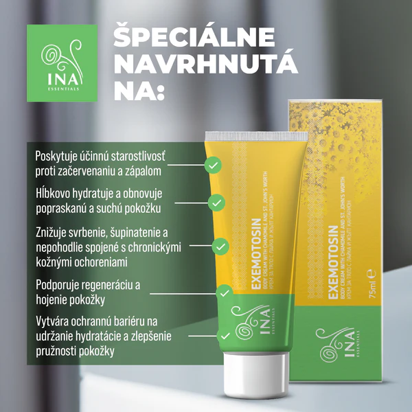 Exemotosin od InaEssentials je vysoce kvalitní, jemný, vyživující krém bez parfemace s přírodními účinnými látkami. Je speciálně vyvinut pro potřeby suché, šupinaté, svědivé a zarudlé pokožky včetně kožních problémů, jako je psoriáza a ekzém.