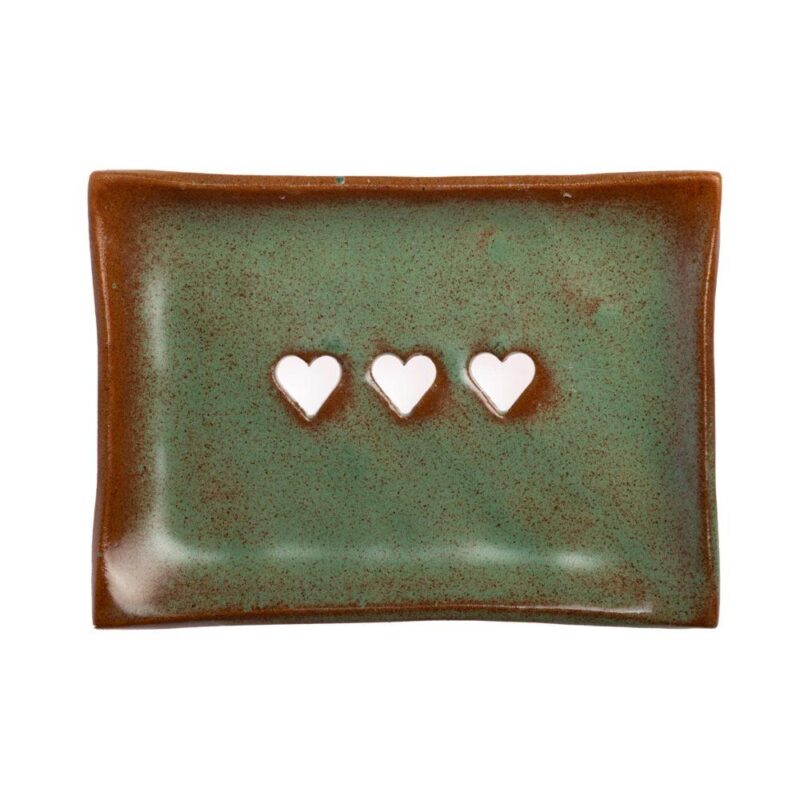 Keramická mýdlenka na nožičkách se zajímavou zelenou glazurou a třemi srdíčky je ručně vyrobená na Slovensku v dílně Keramika Greško. Je modelovaná, ručně malovaná a glazovaná. Jelikož se jedná o ruční práci každá mýdlenka se může mírně lišit od té na ilustrační fotografii.
